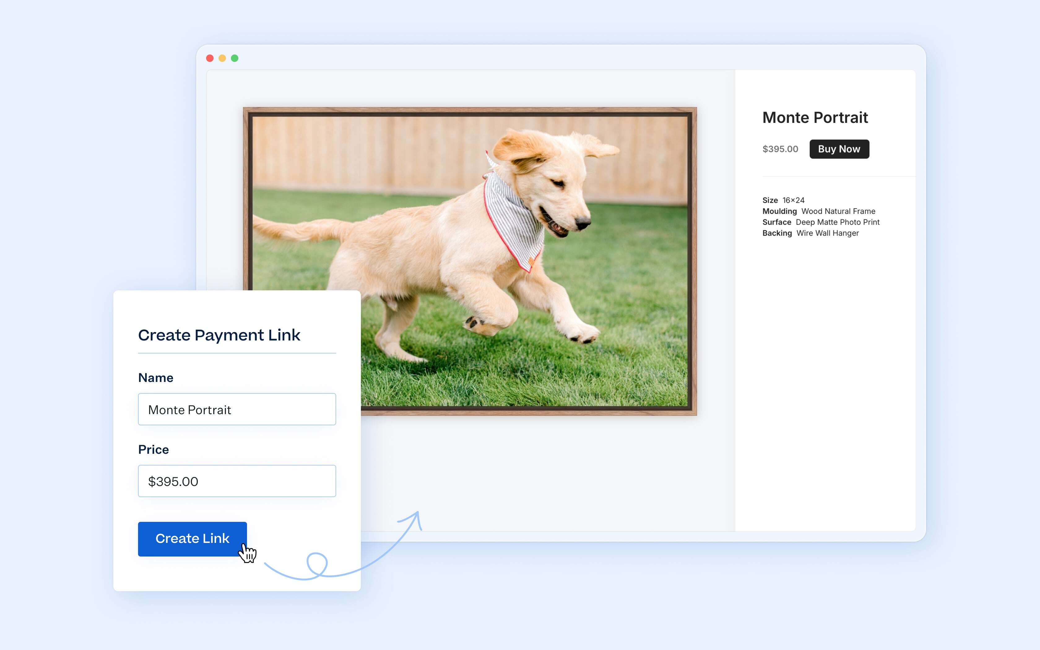 Accept print sales anywhere by creating sharable Payment Links that automatically process and fulfill orders — no store setup required.