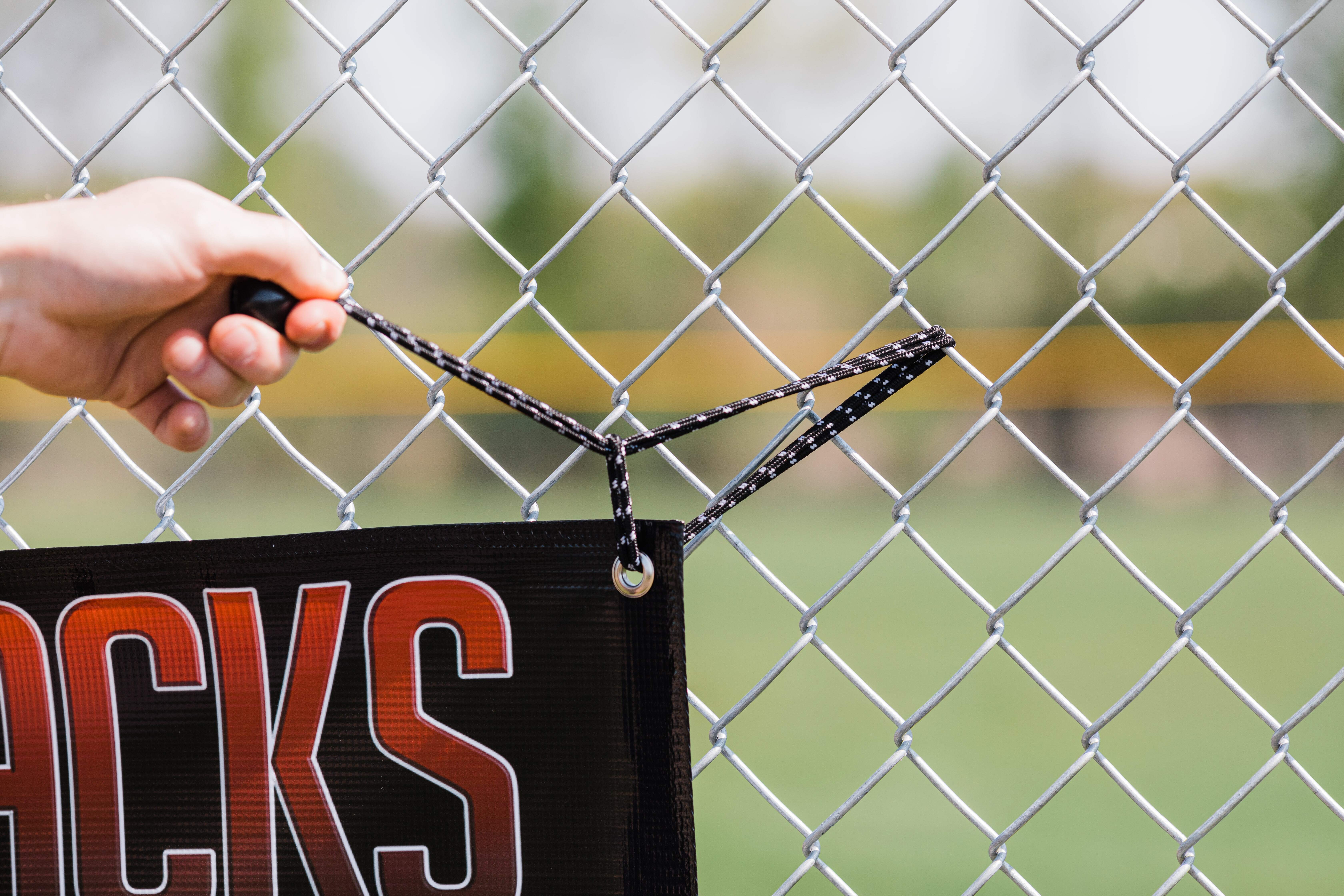 Finished with silver grommets and comes with bungees for quick, secure display |